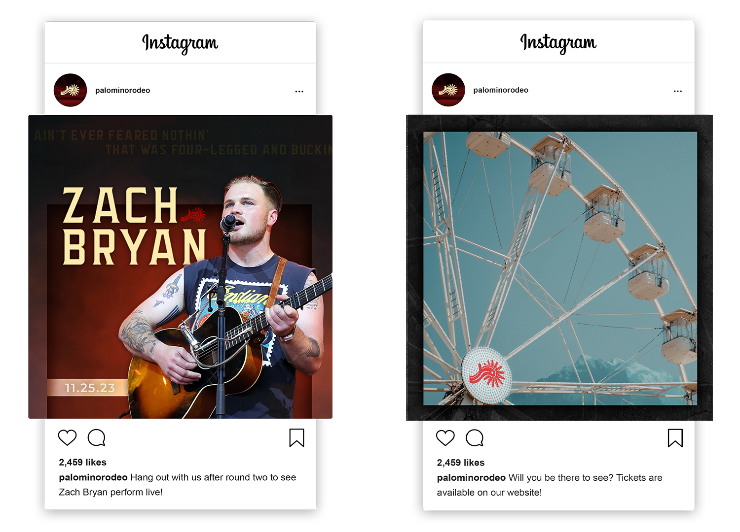 The logo for the Palomino brand consists of three main parts - the type, the border treatment, and the brand's icon. The typography for the logotype is a modern take on a traditional cattle-brand aesthetic, standing tall, bold, and confident and packed with personality. The border treatment reflects the shape of belt buckles worn by cowboys, and allows the logotype to remain as a solid unit. Lastly, the brands icon, a digital illustration of a spur, relates to the grand prize of a pair of golden spurs that the top cowboy receives at the end of the event.